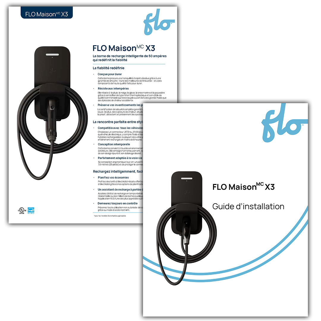 - Installation fixe : La version câblée de la borne FLO Maison X3 est réglée en usine sur 48 ampères afin de faciliter la plupart des installations. Il vous faut dans ce cas un disjoncteur de 60 ampères. Toutefois, si vous désirez profiter de la totalité des 50 ampères disponibles, vous pouvez demander à un électricien d’augmenter l’intensité de courant électrique, à condition d’utiliser un circuit d’une capacité nominale de 70 ampères.